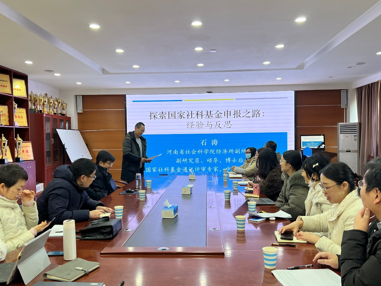 2月14日,受经济学部betway西汉姆联官网邀请,中原青年拔尖人才、河南省社会科学院经济研究所副所长石涛研究员到校开展讲座,主题为 “探索国家社科基金申报之路:经验与反思”,经济学部部分教师参加。